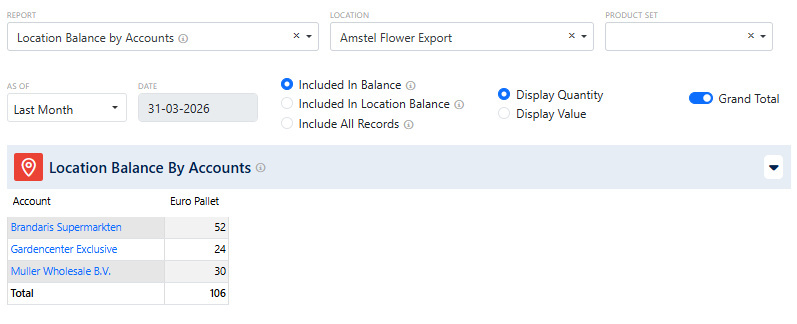 If your counterparty is not a member of the pool you use (e.g. EPS, IPP, IFCO, CHEP, Loscam, LPR, etc.) your accountability towards the pool operator does not change with the transfer of returnable packaging items to that counterparty. You will need your counterparty to return the items to you. In order to monitor that, you want to register a balance with that counterparty. Use the PackControl Pooling rules to automate and correctly register such transfers.